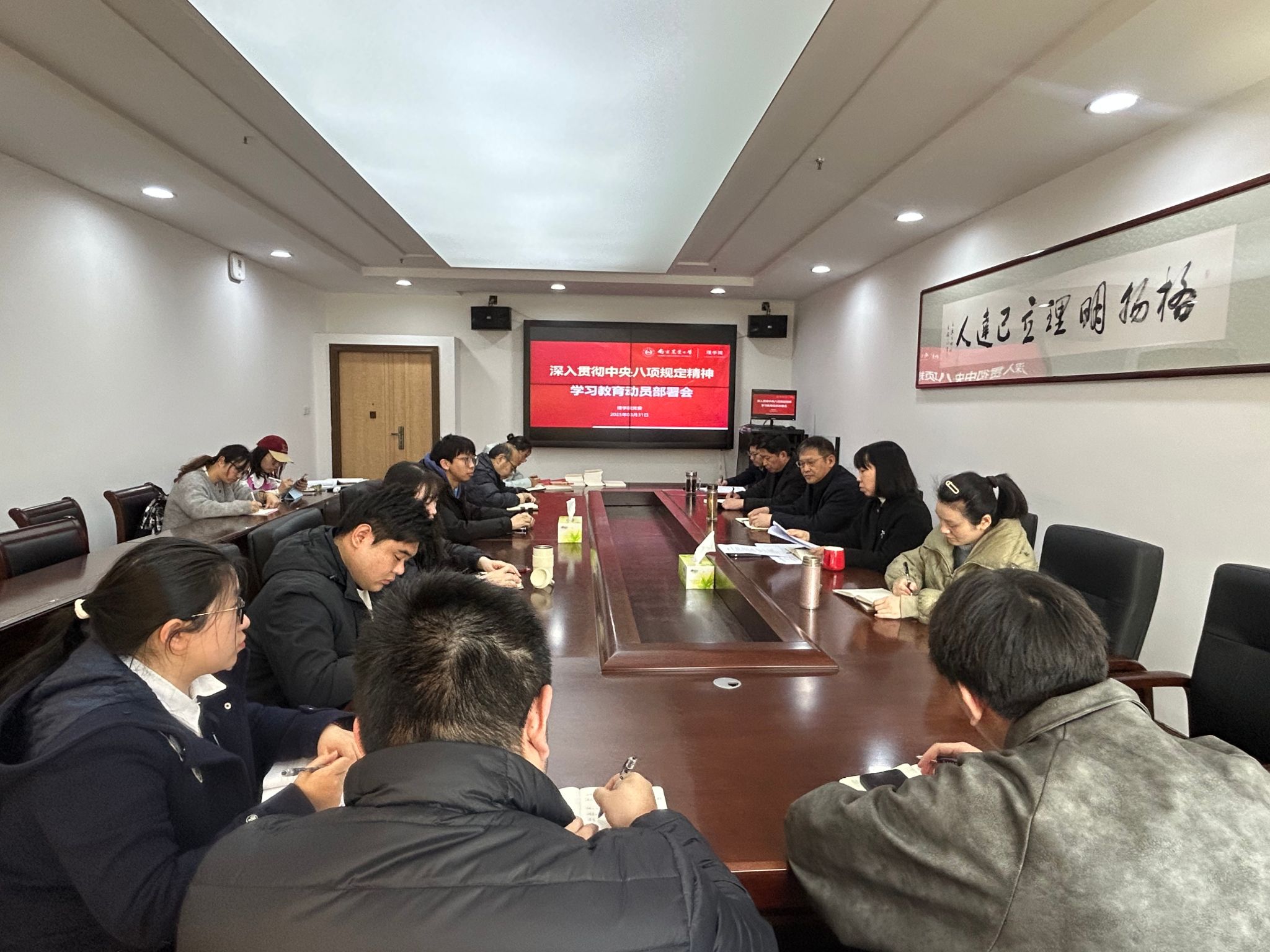 委员会关于开展深入贯彻中央八项规定精神学习教育的实施方案》精神,重点领学了校党委书记王春春的大会讲话精神,集体研学了《关于改进工作作风、密切联系群众的八项规定》原文。