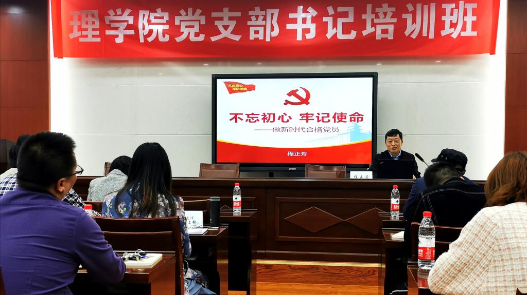 中心组、支部书记以及行政支部带来了《不忘初心、牢记使命-做新时代合格党员》主题党课。程书记从党的初心和使命是什么、为什么要不忘初心、牢记使命、怎么才能不忘初心、牢记使命、如何做合格党员四个方面,高屋建瓴的为学院中心组及支部书记上了一节深刻的党课。用回顾历史和政治的方式,通过对中国近现代史的重要历史时刻的阐述以及对中国共产党成立以来的关键发展时刻的回顾,进一步加深大家对中国共产党“不忘初心、牢记使命”内涵的理解。程书记指出,作为一名党员,要牢记“四个意识”,坚定“四个自信”,自觉做到“两个维护”,坚持学习习近平新时代中国特色社会主义思想,树立科学的世界观,把“为人民谋幸福,为中华民族谋复兴”时刻铭记在心。特别是教师党员,应该始终把为党育人,为国育才作为自己的初心和使命。