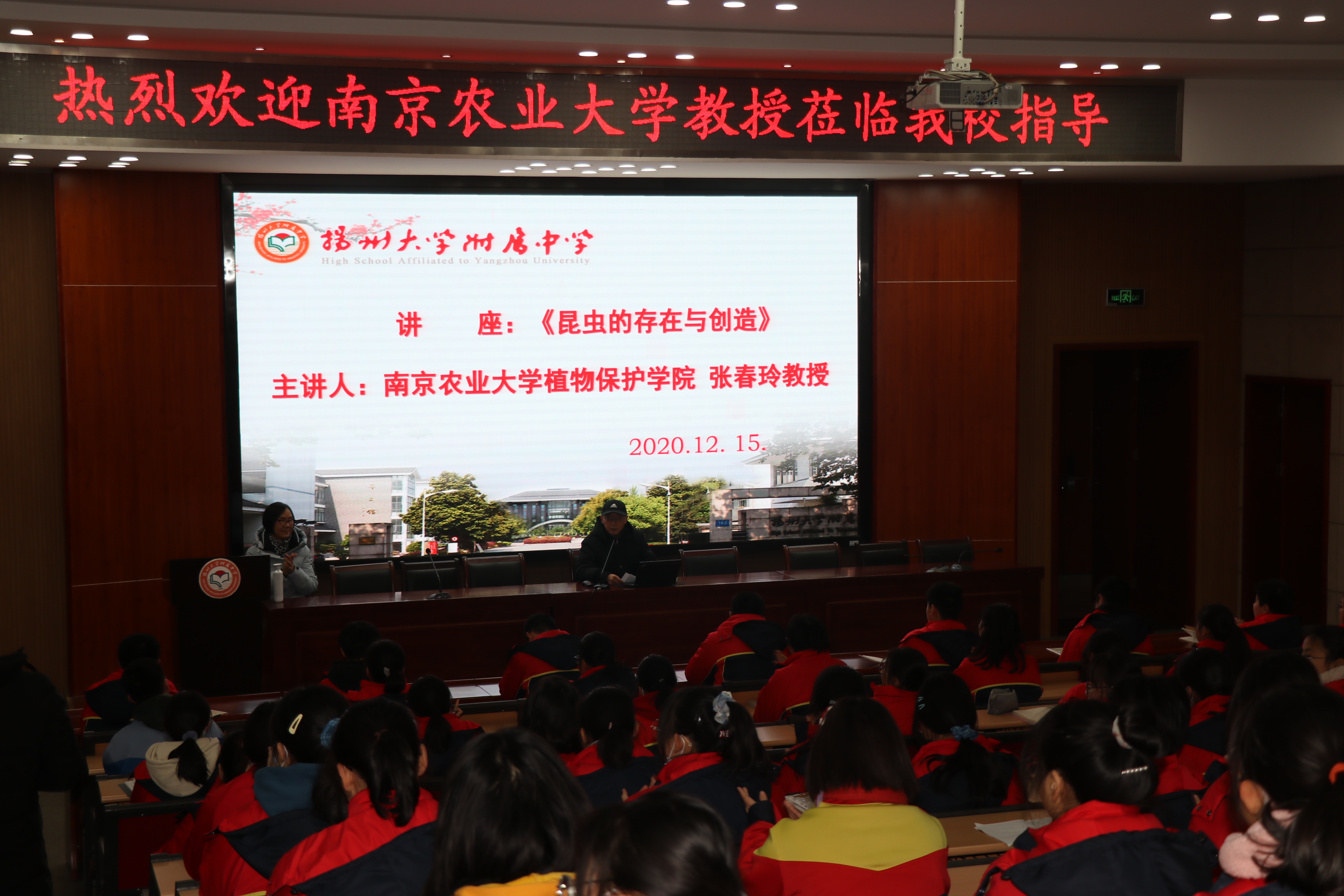 张兆祥老师为同学们介绍了我校的基本情况,并鼓励同学好好学习,提高人生理想。随后邀请植物保护学院张春玲教授为该校全体高一学生带来主题为《昆虫的存在与创造》的主题报告。
