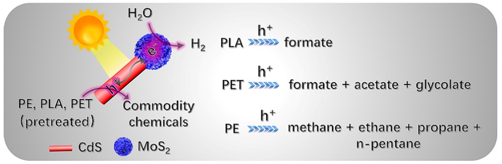 尖端负载MoS2的CdS纳米棒光催化重整塑料机制图