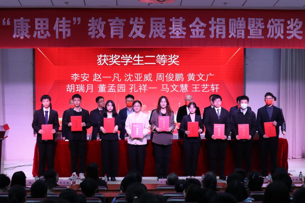 会议第三项议程为宣读2022年度“康思伟”奖教奖学金表彰决定及颁奖仪式,康思伟奖教金获奖教师(10人):陶亚奇、李爱萍、温阳俊、丁煜宾、骈聪、张帆、张明智、杜超、徐凤君、夏青;康思伟奖学金一等奖获奖学生(10人):胡冰馨、李博文、林楚杭、余博远、王师宁、刘菲、张楚姗、陶丹、赵凤月、吉寒冰;康思伟奖学金二等奖获奖学生(10人):李安、赵一凡、沈亚威、周俊鹏、黄文广、胡瑞月、董孟园、孔祥一、马文慧、王艺轩。