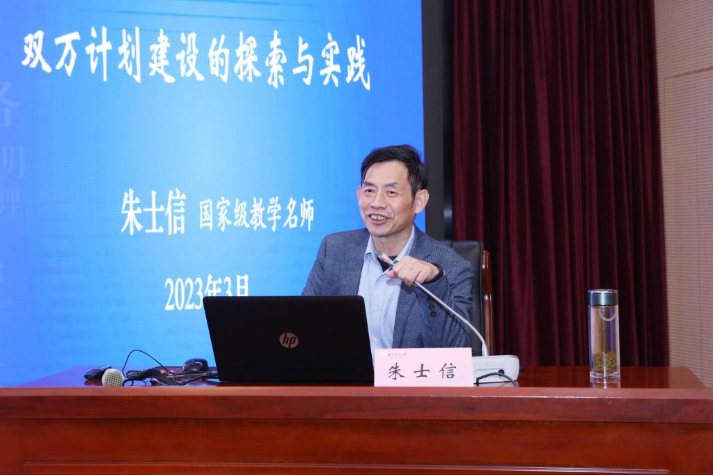 朱士信教授简要介绍了国家“双万计划”——国家级一流专业和一流课程建设背景,并重点结合自身教学管理经验,分别从一流的课堂教学、一流的教学研究、一流的教学团队、一流的教师建设制度、一流的课程思政等方面,深入浅出地阐述了国家一流课程建设的经验做法。他指出,一流的课程一定是受学生欢迎的课程,就是要用最简单的语言,讲解最深奥的理论。他特别强调,课程思政就是要让老师们在教学过程中自然地融入思政元素,在讲授课程的同时对学生成长产生积极影响,做到“润物细无声”。他鼓励老师们要把教学当作自己的事业和爱好,把教学当作艺术,不断地去打磨和求索。报告会交流环节,朱教授与老师们就教学和课程建设等话题进行了深入讨论。
