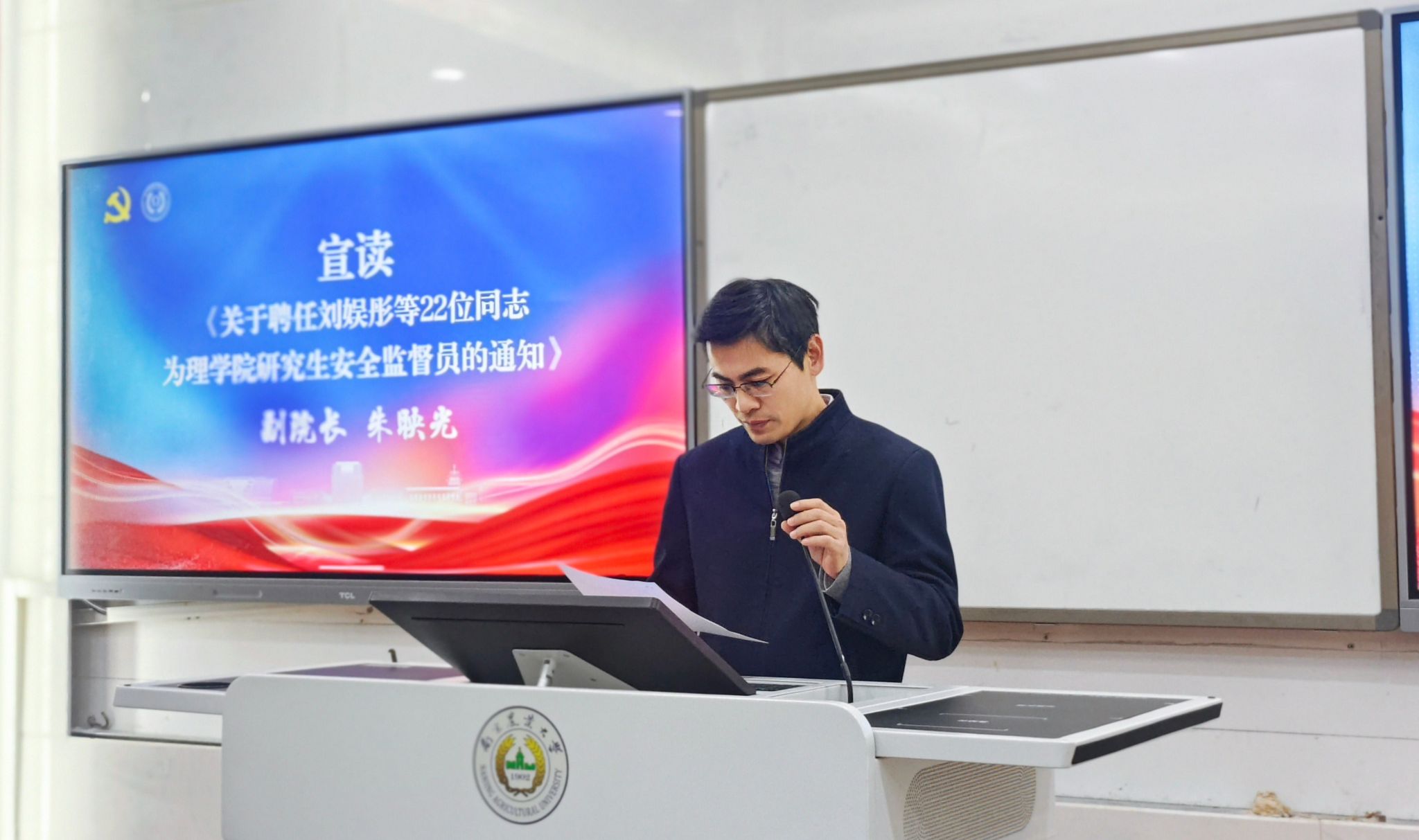 “理响先锋” 启航计划正式启动,研究生党员安全教育暨安全监督员聘任仪式同步顺利举行。院党委书记李日葵,党委副书记冯绪猛,副院长朱映光、张瑾、吴顺凡出席活动,研究生党支部书记、院兼职研究生辅导员及全体研究生党员共同参与。本次聘任仪式由冯绪猛主持。