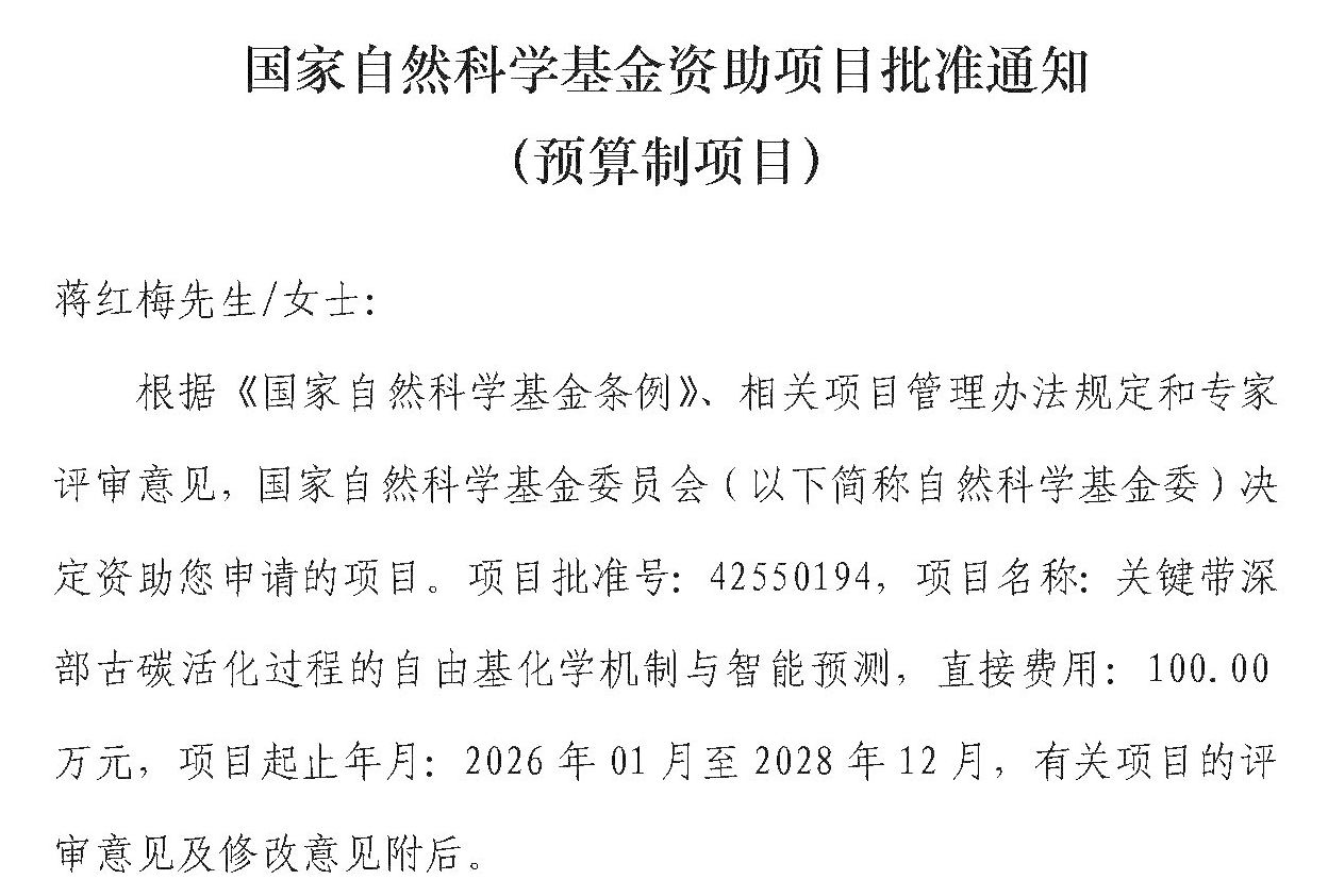 蒋红梅教授、戴军副教授、陈瑶副教授与中国科学院遗传与发育生物学研究所农业资源研究中心秦树平研究员组成的联合攻关团队,历经预申请、正式申请、答辩三轮激烈角逐,成功获批“指南引导类原创探索计划项目:关键带深部古碳活化过程的自由基化学机制与智能预测(联合申请)(100万)”项目。本联合申请围绕“人类活动驱动关键带深部古碳活化”的重大科学问题,揭示人类活动驱动下自由基的生成路径与形成机制,量化不同环境条件下自由基对古碳氧化的贡献率,构建跨尺度智能预测模型。该联合项目作为“人类活动驱动关键带深部古碳活化的机制与效应(主申请)”的重要支撑,标志着肉视频