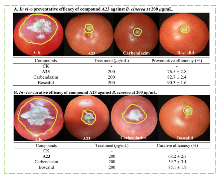 本研究通过在3-羟基黄酮结构上引入苯并咪唑和砜基/羰基基团,构建了一系列共30余种目标化合物。初步离体活性结果表明,大多数目标化合物对灰霉病菌表现出良好的抗菌活性。化合物A23对灰霉病菌EC50值为0.338 μg/mL,优于商品药多菌灵(0.625 μg/mL)。活体实验表明,在200 μg/mL浓度下化合物A23对灰霉病的保护效果可以达到76.5%,治疗效果可以达到68.2%,显示出良好的开发应用潜力。