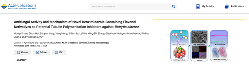 朱映光教授团队以天然产物黄酮醇为骨架,设计并合成了一系列新型黄酮醇类衍生物,系统评估其抗植物病原真菌活性,并深入探讨其作用机制。相关研究以“Antifungal Activity and Mechanism of Novel Benzimidazole-Containing Flavonol Derivatives as Potential Tubulin Polymerization Inhibitors against Botrytis cinerea”为题,发表于农业综合国际权威期刊《Journal of Agricultural and Food Chemistry》。