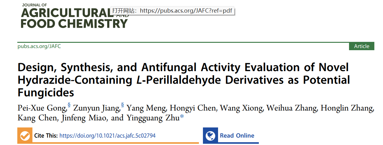 章维华教授对研究设计、论文修改提出了宝贵意见与支持。该工作得到国家重点研发计划、江苏省农业科技自主创新项目及中央高校基本科研业务费等项目支持。全文链接://doi.org/10.1021/acs.jafc.5c02794