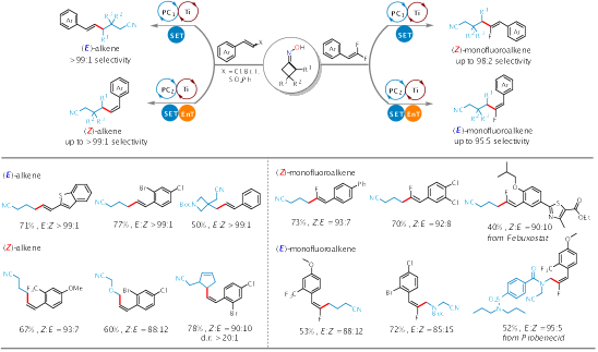 图1.可见光/钛协同催化环酮肟与卤代烯烃立体发散性偶联反应