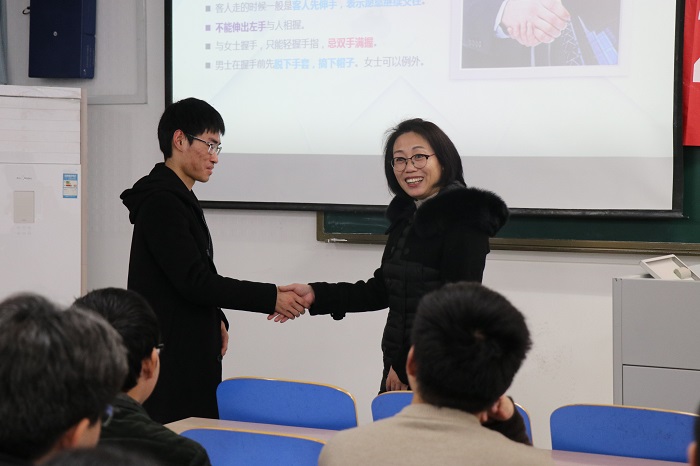 交流分享会还请到了南京艾瑞培训学校的孟丽敏老师给同学们讲述了职场礼仪的要点以及企业如何考察面试者。孟老师说道:“一个人礼仪决定着其他人对其的第一印象。所谓精英,他一定是对自己有着严格到要求,礼仪也是如此。”孟老师之后又展示了一份企业面试的评价单,其中位列第一条的考察就是礼仪、服饰和举止;另外还有人生态度和自我认知、组织能力、解决问题能力、沟通能力以及专业知识。