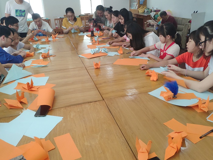 活动共有三个游戏,第一个游戏是折纸,每个成员负责指导一位小朋友或一些参与的老人,对于部分学习较快的小朋友,我们的小组成员还教授了他们玫瑰花的折法。第二个游戏是你画我猜,游戏由汪雨蝶主持,主持人告诉第一个小朋友一个词后,然后依次画出来给后面的小朋友看,最后一个小朋友需要说出这个词。游戏期间,每个小朋友发挥自己的想象力积极进行绘画创作,充分展现了新一代年轻人丰富的想象力。最后一个游戏是运气球,两个人为一组,背靠背将气球夹在中间运到对面,运得最多的小组获胜。所有小朋友积极参加游戏,展现了他们团结合作的能力。