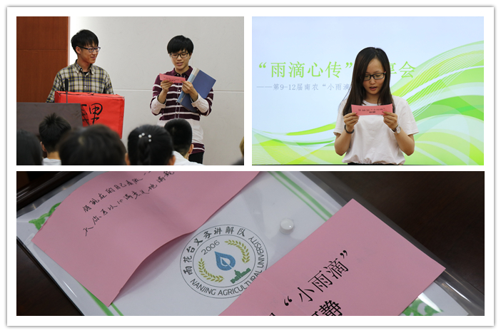 接下来,第12届“南农小雨滴”的队长徐毅正代表全体新成员表态,未来将以传递“雨花精神”为己任,在未来一年中传承传统,砥砺前行。老成员们也表达了自己对新成员的祝福,会前精心准备了祝福的话语,由新成员们抽取并分享,将一届届“南农小雨滴”的精神进行传承和发扬。