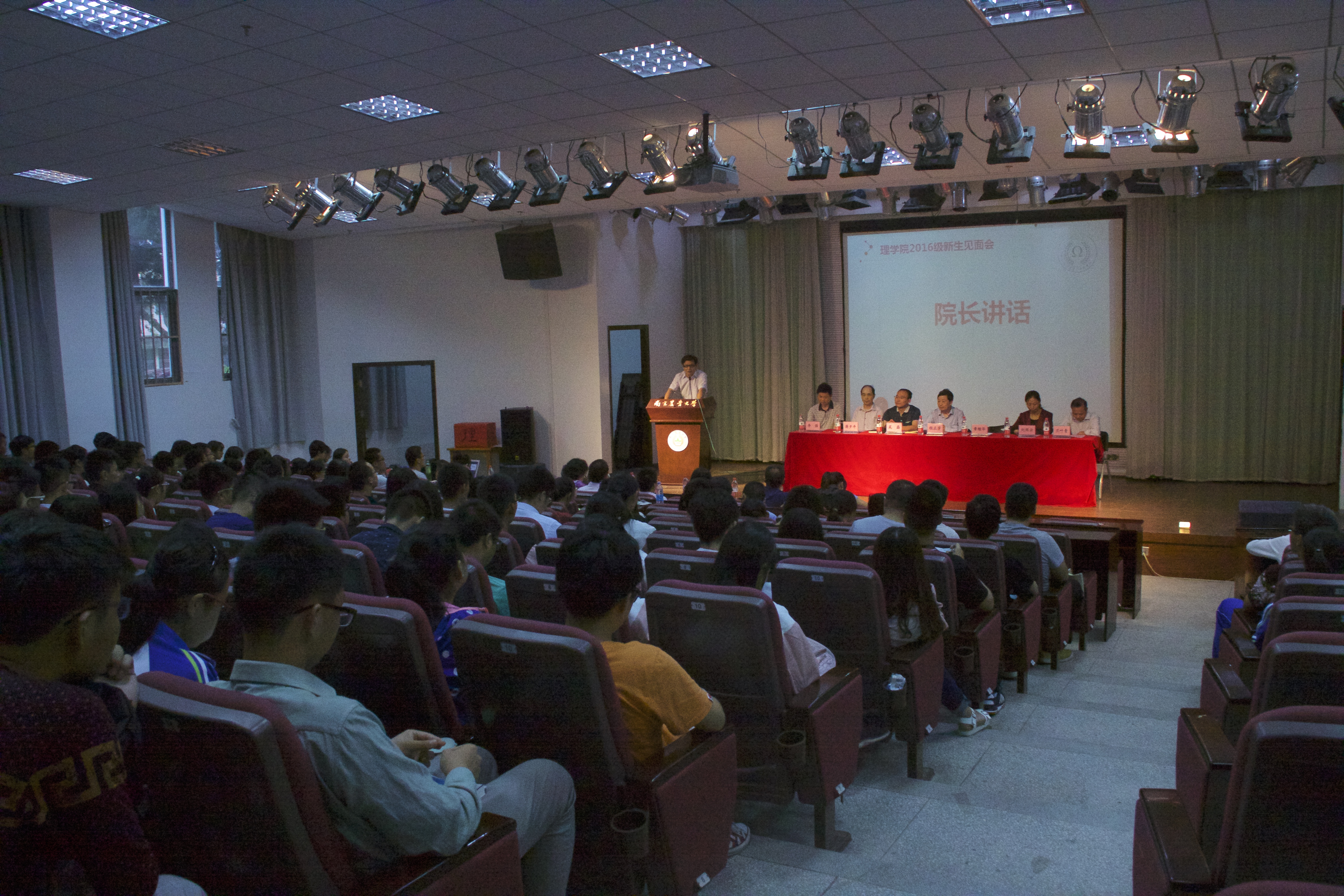 报告厅隆重举行。学院党委书记程正芳副教授、院长章维华教授、党委副书记刘照云老师、副院长吴磊教授、物理系主任蒋夕平、化学系主任兰叶青,数学系主任李强,各系班主任、教务老师、辅导员、教师代表以及2016级全体本科生和研究生新生参加了此次会议。