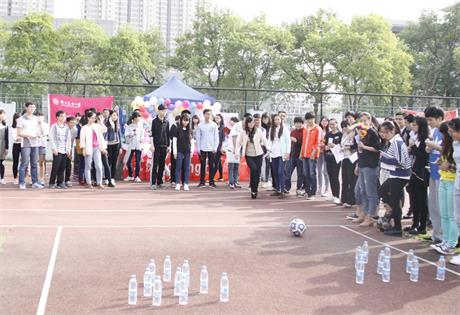 我院在本次“三走”嘉年华活动中准备了极具娱乐性的自创游戏——足式保龄。将十个矿泉水瓶放在地上作为保龄球,参赛者通过踢足球来击倒矿泉水瓶。以踢倒更多的矿泉水瓶来赢得奖品。