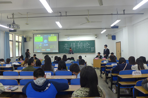 4月22日三点整,先锋辩论赛在教四楼B303教室激情上演。经过双方四十多分钟的唇枪舌战之后,最终由代表反方的肉视频