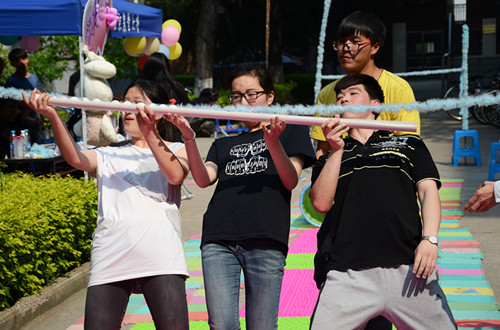 活动以四人为一组,共通过六个关卡,按全部通过的时间发放奖品。颇具趣味的游戏和丰富的奖品不仅吸引了我院学生,连外院学生也跃跃欲试,纷纷加入到了报名的队伍中。第一关“酸爽活力跳”是在指压板上跳绳,让参与同学充分感受了指压板按摩脚底的“酸爽”,参与者层出不穷的尖叫声,搞笑的动作让周围的人不禁捧腹大笑;“鱼跃龙门”——在腿间夹气球高跳拍系在两杆间的羽毛球,不仅考验大家的忍耐力还有击球的准确度;“小鹿乱撞”是公认最“酸爽”的一关,在指压板上跳扭着把系在腰上纸巾盒中的乒乓球甩出来,大家或是金蛇狂舞,或是左右颠簸,动作好不逗趣,观看的同学都开心不已,忍不住拍掌大笑。无论是“甜蜜瞬间”的戴着气球帽子吃糖,还是拿着里面放着一排乒乓球的塑料管过杆子的“四平八稳”,以及最后“信仰之跃”都是妙趣横生,令人忍俊不禁。