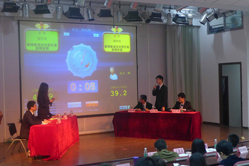 辩论队的风采。一辩陈鑫立论陈词时言语清晰而有理有据,其井井有条的阐明我方观点,为这场辩论赛打响了漂亮的第一炮。在自由答辩环节,二辩李帅口若悬河,言辞犀利,直击对方辩友言语中的漏洞,步步紧逼。三辩冀昊琰则采用自问自答的方式,以退为进。总结陈词中,他直面双方的争锋点,明确表达了我方的观点,以其清晰的阐述再一次巩固了我方观点。